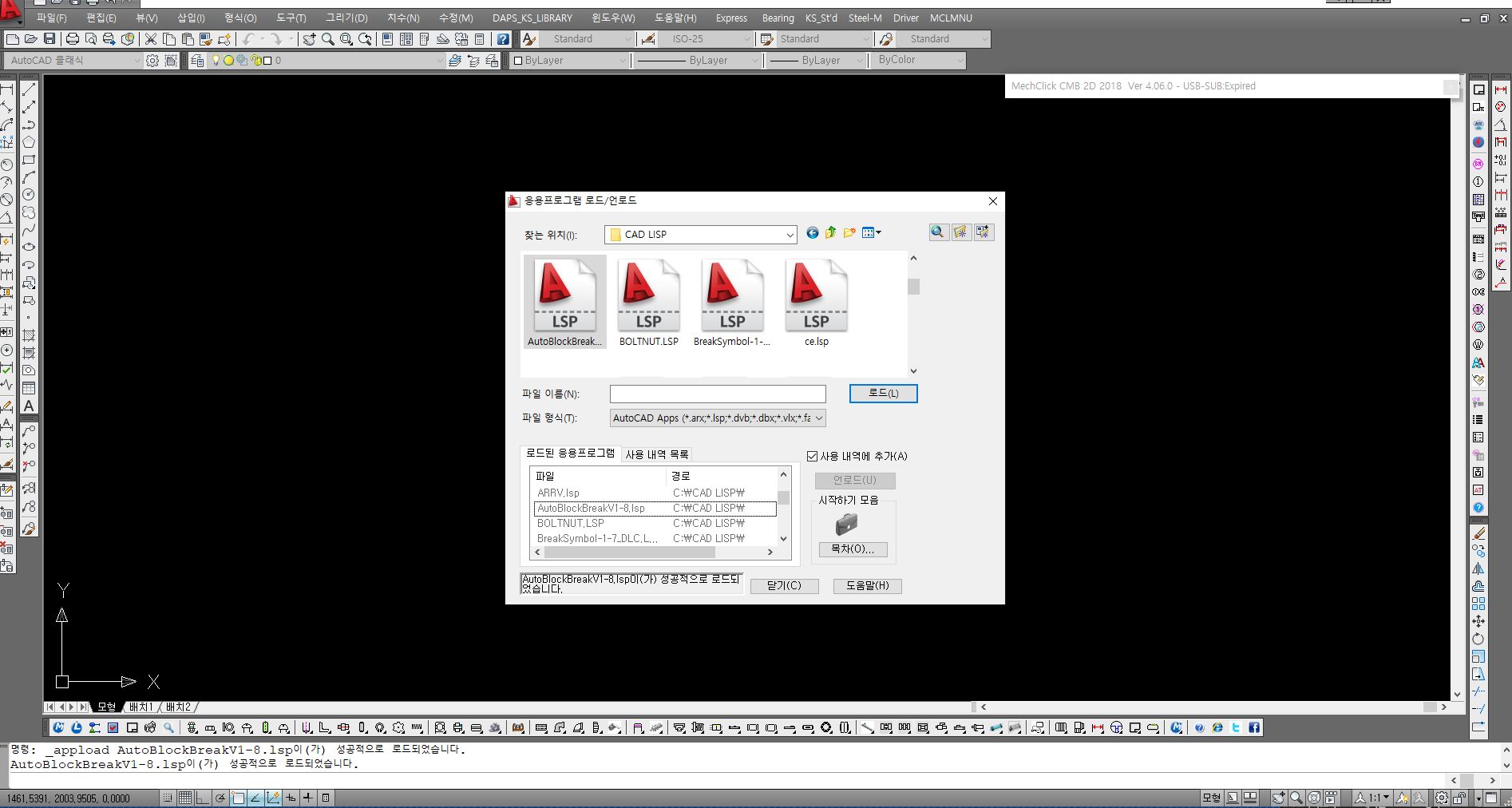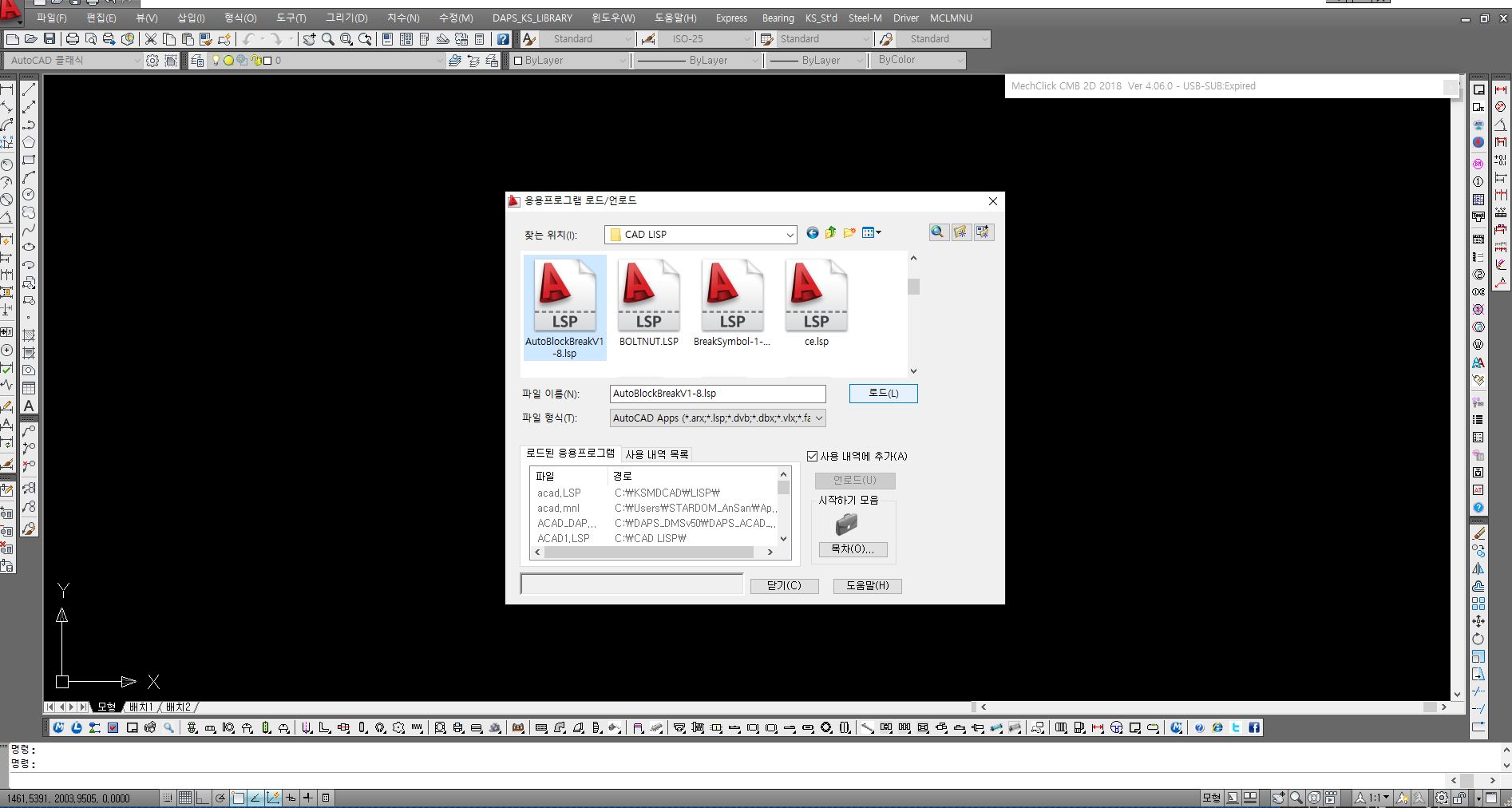 풀다운 메뉴의 도구 -> auto lisp -> 응용프로그램 로드